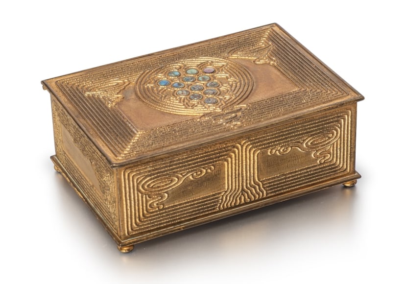 The Abalone desk set pattern was introduced about 1910, and was the sixth of the more than twenty patterns that were ultimately available. It was produced in a shiny gilt or muted gold-dore finish. This Abalone Humidor Box has retained its orginal gold dore finish. The inside of the box is lined with cedar wood. The underside of the box is inscribed: TIFFANY STUDIOS/NEW YORK/1150. Height: 2-1/2". Width: 6-3/4". Depth: 4-3/4".