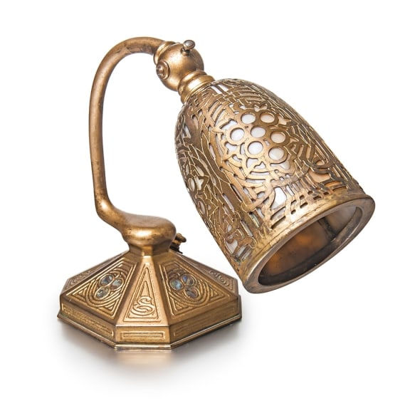 The smaller of the two lamps available in the Abalone desk set pattern. This gilt-bronze unit is decorated with abalone shells on the base. The angle of the shade is adjustable, and is made of etched metal lined with curved amber glass. Underside of base stamped: TIFFANY STUDIOS/NEW YORK/556. Height: 9".
