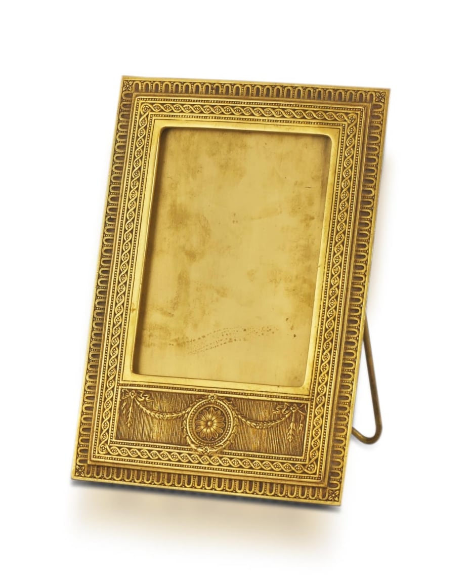 The Adam pattern references the neoclassical elements of Georgian design. It features wreaths, bows and swirling ribbons, rosettes, and fluting. This picture frame is in a gilt bronze finish, and supported with an easel stand. Stamped: TIFFANY STUDIOS/NEW YORK/1786. Height: 9-1/2".