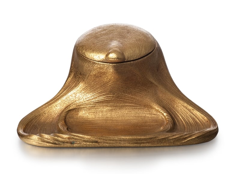 Gilt-bronze inkstand with clear glass inkwell insert. Stamped: TIFFANY STUDIOS/NEW YORK/1037. Height: 3". Width: 8".