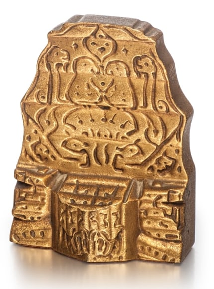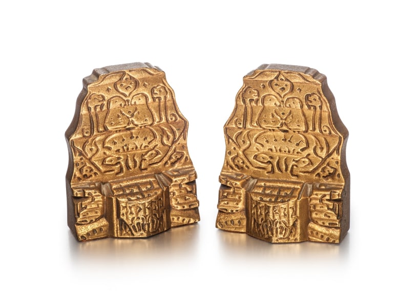 These Coptic Bookends are fine examples of Tiffany Studios Fancy Goods. This line of products were intended to encompass luxury household items, and included pieces such as inkstands, candelabrum, mirrors, utility boxes, and bookends. This pair of bookends is made of bronze with a gold dore finish, the Aztec inspired design is emphasized by the sculptural surface. Underside stamped: TIFFANY STUDIOS/NEW YORK/2010. Height: 5".