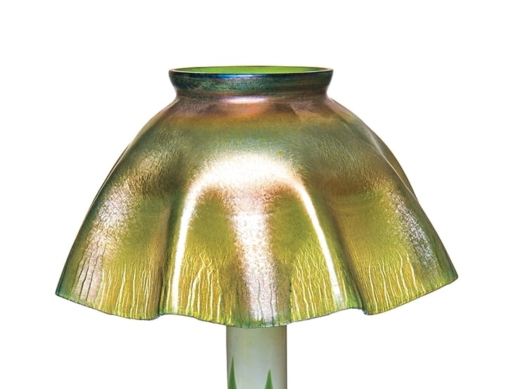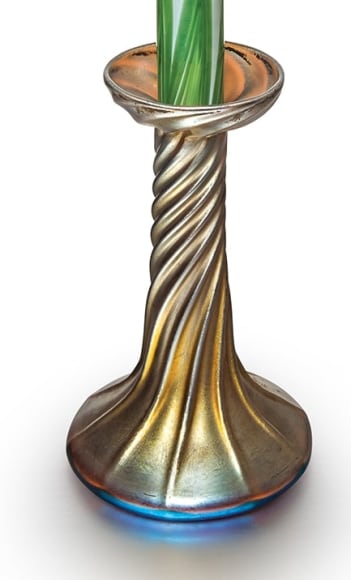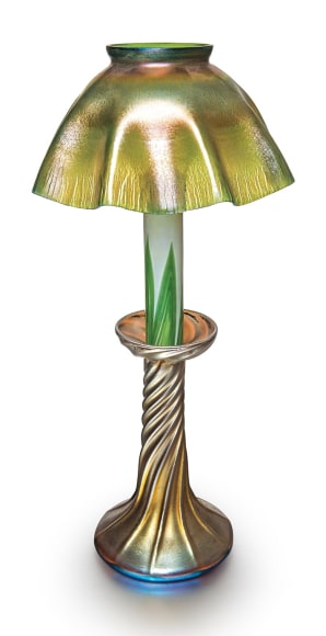 Candle lamp with matching gold iridescent Favrile glass base and shade. The "feathered" design on the candle holder tube is fitted with a spring to support the shade. Base and shade inscribed: L.C.T. Height: 14-1/2".