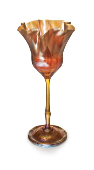Louis C. Tiffany used the term "Favrile" to describe the blown glass that he produced. The colored and heated glass combined with metalic vapors to produce a unique iridescence. Tiffany frequently used nature as a source of inspration for his works, such as the Flower Form. The slender glass stem topped with a bowl in the shape of a blooming flower is more decorative than functional. This iridescent Favrile glass "Flower Form Vase" has a ribbed base and a multi-fold ruffled top. A similar example is found in the collection of the Cooper Hewitt Museum, NYC. Inscribed: L.C.Tiffany Favrile 2457. Height: 10-1/2".