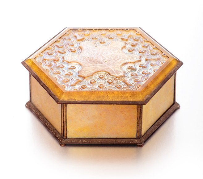 Gold iridescent Favrile glass box, with gilt bronze frame, hinges and feet. Hexaganal with beveled edges and an embossed pattern on lid. Tiffany & Co's. 1919 Blue Book listed items such as this as a Favrile Glass Jewelry Box. Circa: 1920s. Stamped: TIFFANY FURNACES. Height: 2". Diameter: 6".