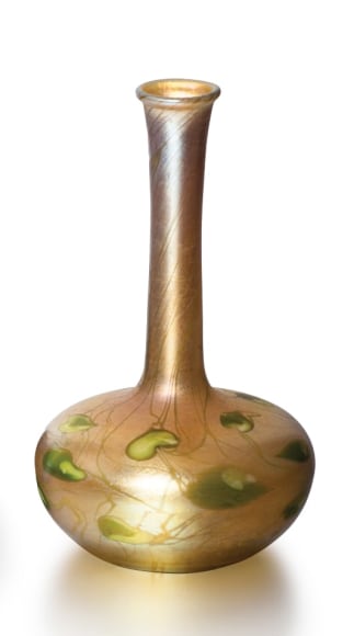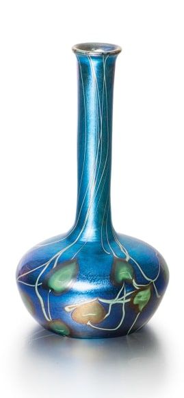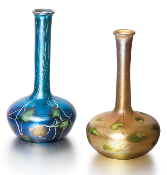 The decorated Favrile glass bud vases are available as a pair or individually. Each vase has a trailing vine decoration, with iridescent highlights. The blue vase is inscribed: L.C.Tiffany Favrile 219G-1. Height: 6-1/4". The gold vase is inscribed: L.C.Tiffany Favrile 7645. Height: 5-3/4".