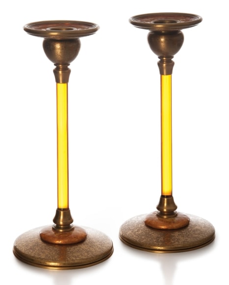 Pair of vitreous enamel, copper, glass and bronze dore candlesticks. The heads have metal candle holder inserts and decorative red enamel. Stamped: LOUIS C. TIFFANY FURNACES INC. 41 and logo. Height: 9".