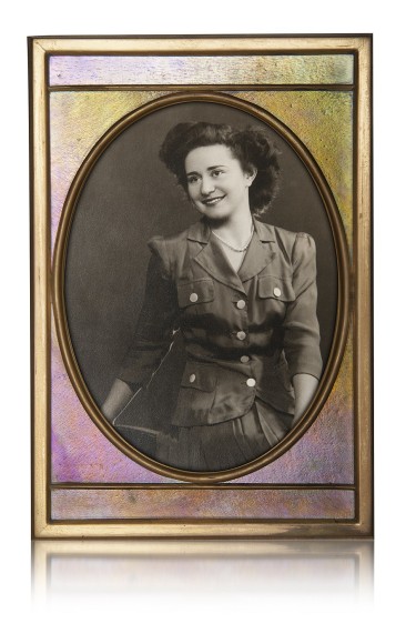 TIffany Studios/Tiffany Furnaces picture frame with iridescent glass and gilt bronze frame and stand. Stamped: Louis C. TIffany Furnaces, with monogram. Height: 10". WIdth: 7".