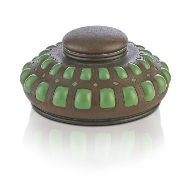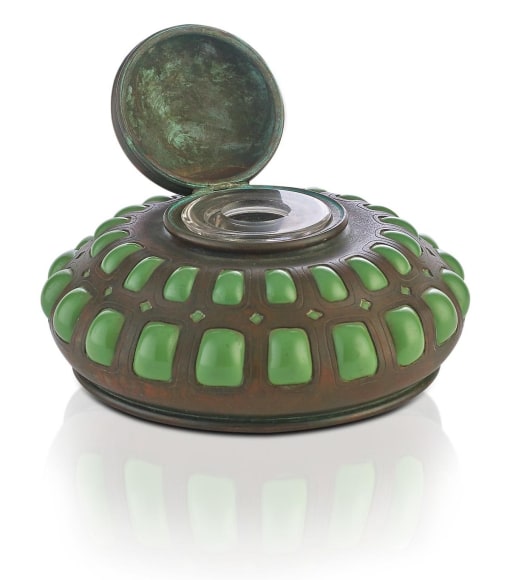 THis green reticulated glass inkstand, with glass liner, is an example of the Tiffany Studios Fancy Goods. This piece was meant to be both decorative and useful, it is bronze with a brown patina finish. Stamped: TIFFANY STUDIOS/NEW YORK/849. Diameter: 6".