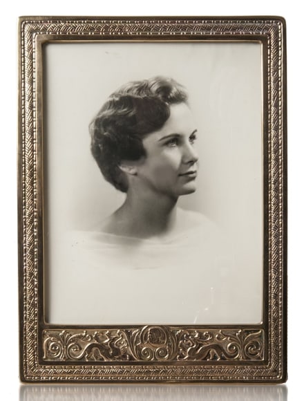The Spanish pattern was one of the later desk set patterns created by Tiffany Studios, as price catalogues of the time indicated they were available in the late 1920s. This is 20 years later than the first desk set items of the late 1890s. The Spanish pieces are sculptural and detailed, with the main motif being medieval ornamentation interwoven with fantastical animals and symmetrical designs. This frame is embellished with a male bust in a medallion and two winged dragon-like creatures. The Spanish pattern was produced in gilt bronze, this frame has a gold dore finish. Stamped: TIFFANY STUDIOS/NEW YORK/1892. Height: 11-3/4". Width: 8-1/2".