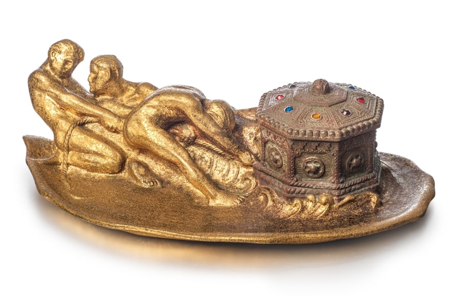 The Three-Men and a Chest Inkstand is the most sculptural of all the inkstand models. It was produced in several finishes, and this one is brown patina and gold dore. The lid is inset with mixed colored glass beads, and the inkwell has a clear glass liner. Stamped: TIFFANY STUDIOS/NEW YORK 1038. Length: 7-1/2".