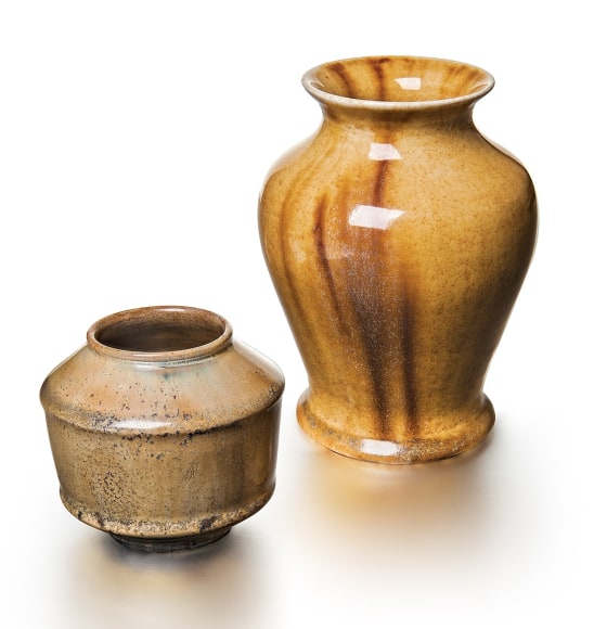 Tiffany Studios Favrile Pottery was one of the later mediums explored by Louis TIffany. It remained a small department of the Company, and relatively few items - some estimates are 1500 - were produced. Tiffany Furnaces produced the pottery line at the Corona, Queens factory, from 1904-1914. These two vases were made from molded castings, and glazed both inside and outside. The earthtone colors are typical of those favored by Tiffany. The left vase is inscribed with the LCT monogram, and is 3"H. The right vase is also inscribed with the LCT monogram, and is 5-1/4"H.