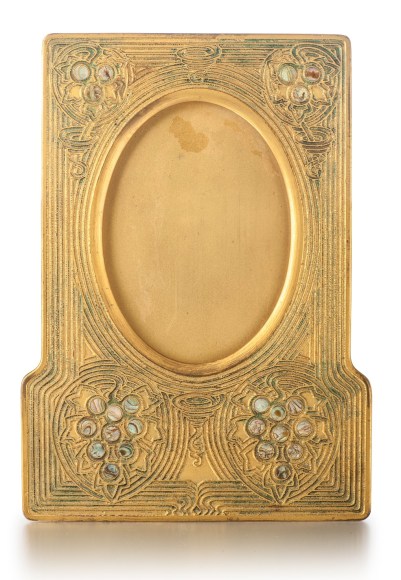 An Abalone Picture Frame having four panels of the decorative grape clusters, leaf and vine motif. Inlaid abalone shell discs form the grape clusters, and are surrounded by ridges with the original polycromed finish. Stamped: TIFFANY STUDIOS/NEW YORK/1171. Height: 10". Width: 7". Opening: 5-1/2" x 4".