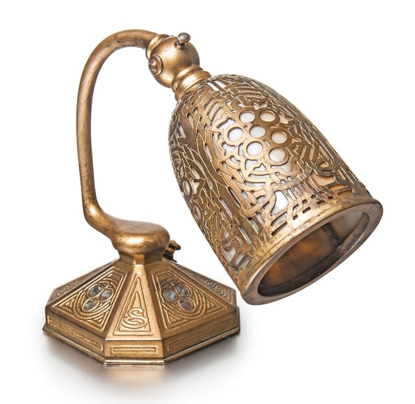 This is the smaller of the two lamps available in the Abalone desk set pattern. The base of this gilt-bronze unit is inlaid with abalone shells, and the shade is made of etched metal lined with curved amber glass. The angle of the shade is adjustable. Underside of base stamped: TIFFANY STUDIOS/NEW YORK/556. Height: 9".