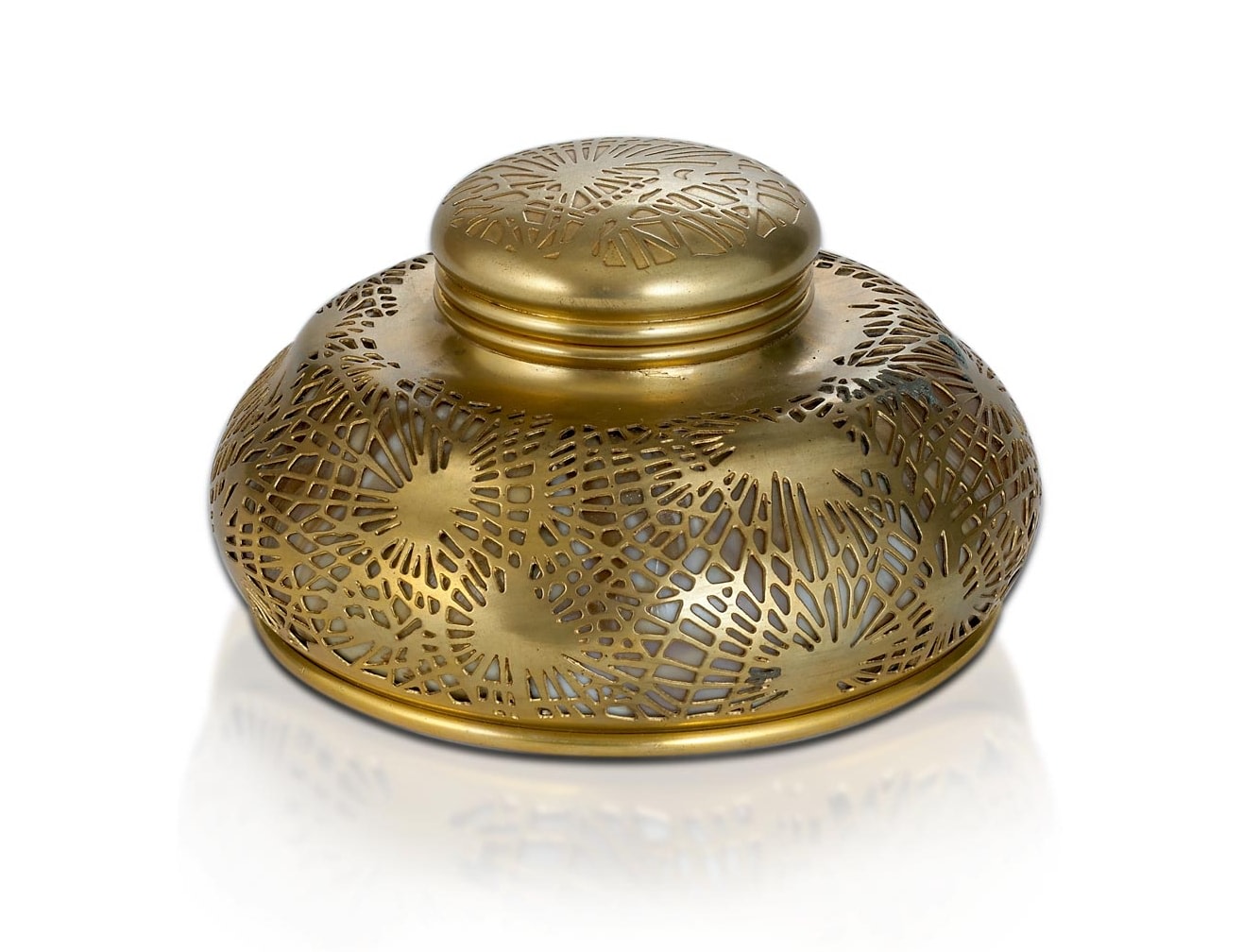 The inkstands were considered an essential item of any desk set, and the Pine Needle pattern had five different styles to choose from. This is the largest model with a single inkwell, and is made of etched metal in a gold finish over amber and white marbled slag glass. The inkwell insert is clear glass. Underside is stamped: TIFFANY STUDIOS/NEW YORK/847. Height: 3-3/4". Diameter: 7".
