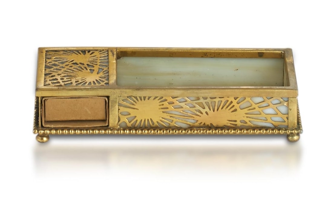 The Match Safe and Cigarette Tray is a rare item. The amber and white marbled glass is in excellent condition, the etched metal shows some minor wear, and the decorative beading adds attractive detailing. Length: 6". Width: 2-1/2". Height: 1-1/2". Stamped: TIFFANY STUDIOS/NEW YORK/965.
