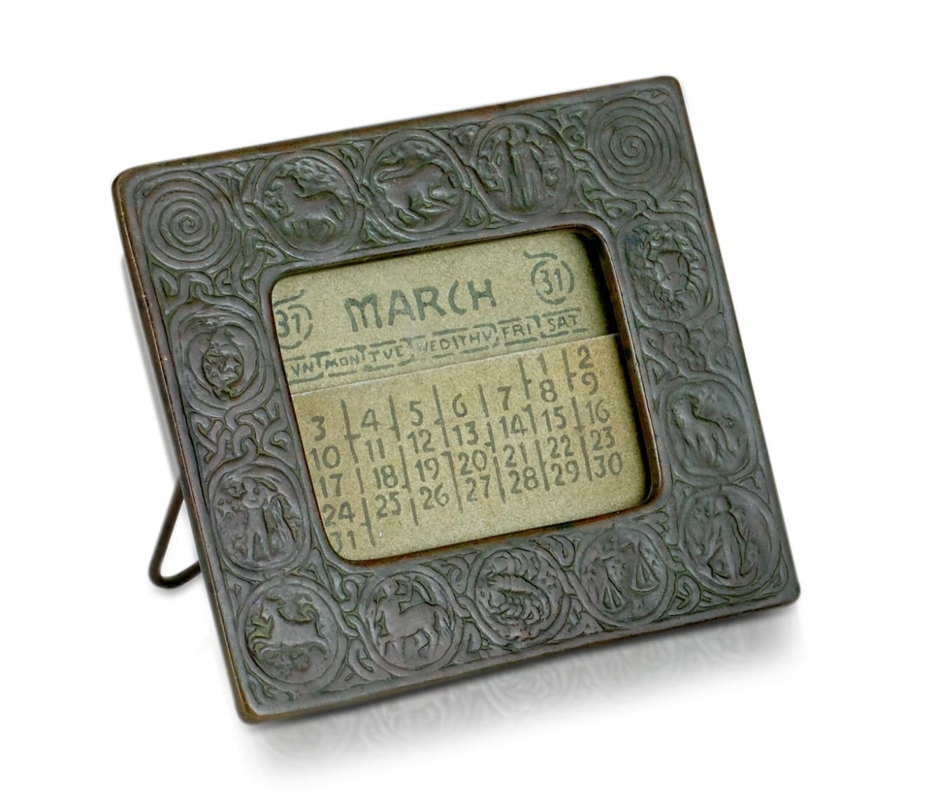The Zodiac pattern perpetual calendar frame came in several sizes, this example being the largest model. The twelve stylized zodiac symbols are interconnected with decorative banding. The daily and monthly cards are rotated to correspond with the date. This frame rests on an easel stand, has a green-brown patina finish, and is shown with the original calendar inserts. A similar frame is in the collection of the Metropolitan Museum of Art in NYC, and can be seen on the Museum's website. Stamped: TIFFANY STUDIOS/NEW YORK/943. Height: 7". Width: 8".