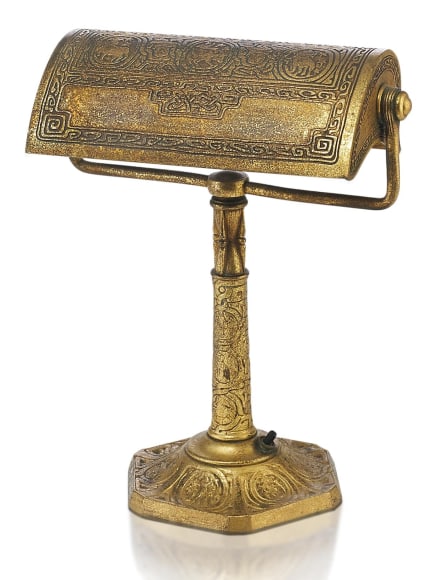 This desk lamp is one of serveral available in the Zodiac pattern. Medallions of zodiac signs embellish the base and shade, and intertwining bands weave the medallions together. The shade tilts, the design is acid-etched into the gilt bronze, and the base has a single socket. Stamped: TIFFANY STUDIOS/NEW YORK/668. Height: 23-1/2". Width: 11".