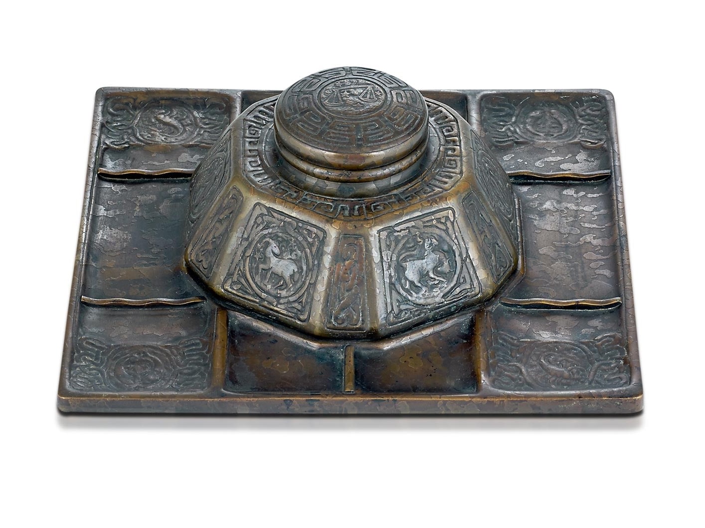The Partners Desk Inkstand is referred to as the "Inkstand for Double Desk" in the original Tiffany Studios catalogue. The octagonal inkstand is mounted on a pen tray, has a clear glass inkwell insert, and an acid-etched statuary bronze finish. The Zodiac signs are carved in low relief on the medallions which are connected with interlacing bands. Stamped: TIFFANY STUDIOS/NEW YORK/1073. Width: 10". Height: 4".