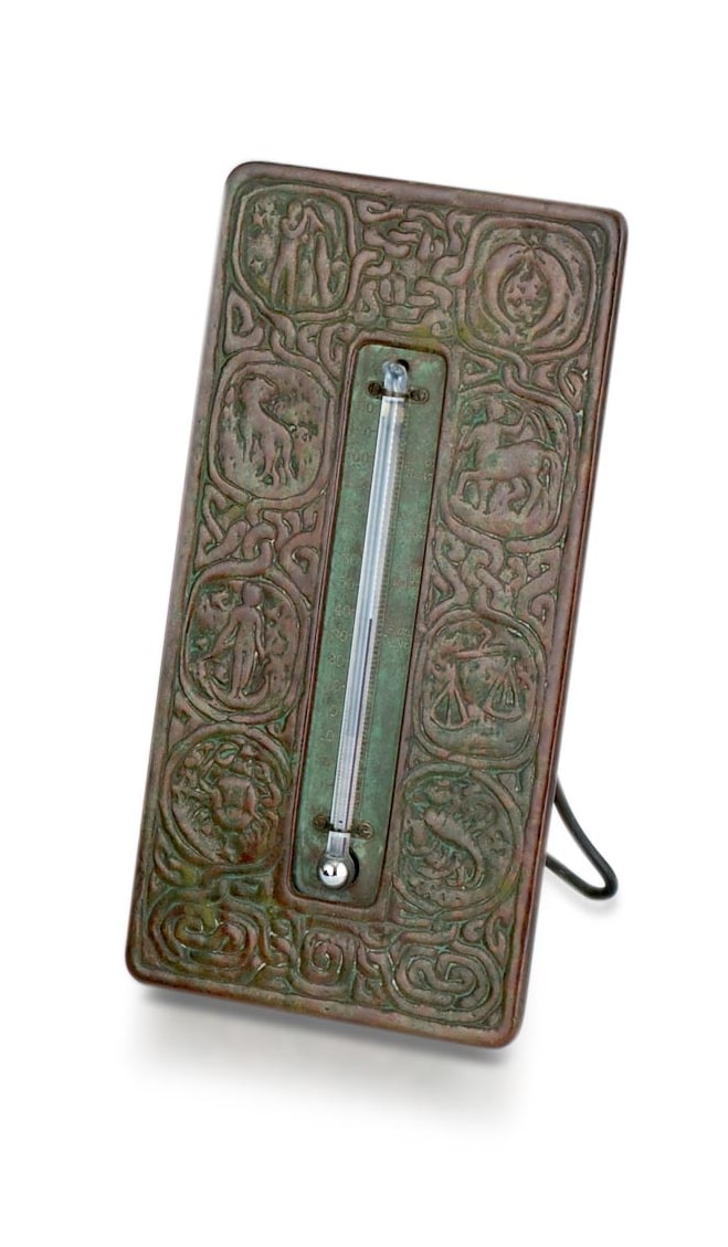 Eight stylized Zodiac symbols are inscribed within medallions around the border and interlaced with decorative banding. The original mercury filled glass tube is held in place with bronze clips, and the temperature scale is inscribed on the front panel. An easel stand supports the thermometer, and the finish is green-brown patinated bronze. Stamped: TIFFANY STUDIOS/NEW YORK/1014. Height: 8". Width: 4".