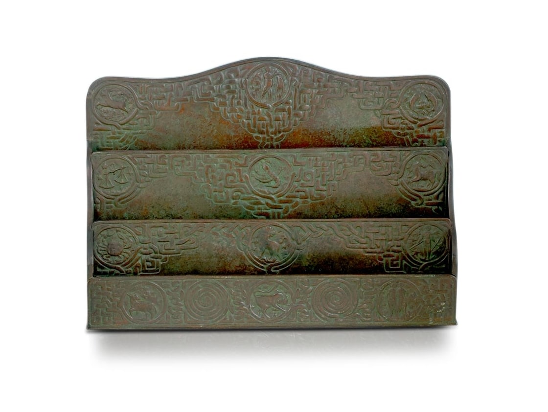 The paper rack is often included in a desk set, whether it is this large three-compartment size, the smaller two-compartment size, or the open-ended letter rack. Zodiac symbols embellish the back surface as well as the front panels. This paper rack is bronze and finished in a green-brown patina. Stamped: TIFFANY STUDIOS/NEW YORK/1030. Height: 8-1/4", Depth: 3-1/4", Width: 12".
