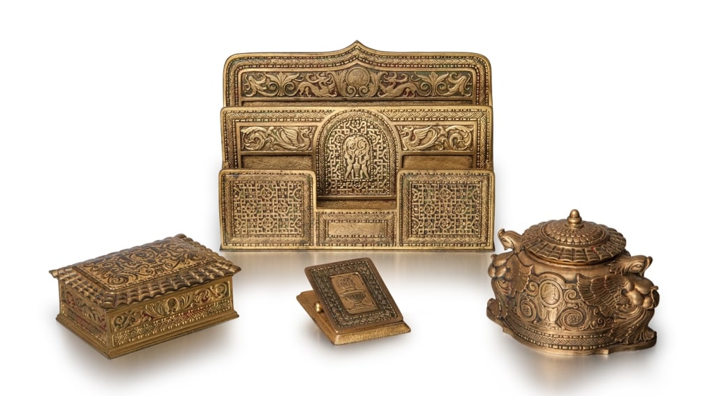 The letter rack is unique with its arabesque design element. It is richly decorated with fantastical dragons, a male bust, two young nudes, latticework, and a parquetry-type border. The inkstand has two winged creatures in high relief and a reticulated lid that references a tile roof. The utility box lid similarly references a tile roof, while its side panels have a male bust set within a midieval flowing foliage design. The paper clip features a flame and urn. All items are stamped: TIFFANY STUIDOS/NEW YORK and numbered.