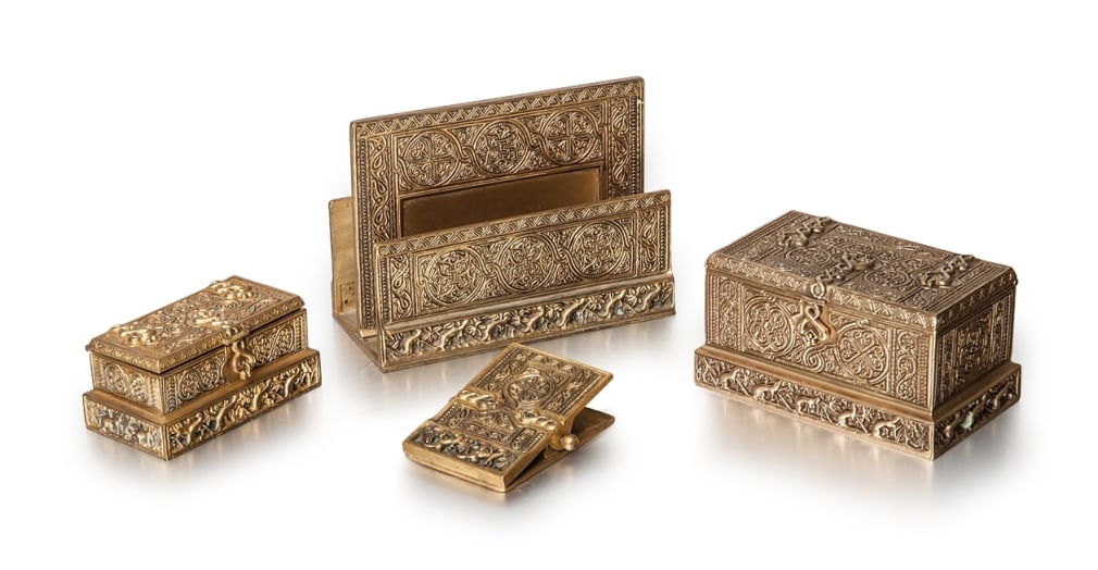 The Venetian pattern, considered to have been introduced in 1908, was in production for many years. Almost all the surfaces are elaborately decorated, except for the tray troughs and ashtray bowls. The panels of the letter rack are also left unadorned, as these would normally be covered with papers. The top of the notepad holder has the unique and functional lid hinge and hasp. Blank surfaces are avoided in this pattern, as even the weighing surface of the postage scale has the tooled leather motif. All pieces are stamped: TIFFANY STUDIOS/NEW YORK and numbered.