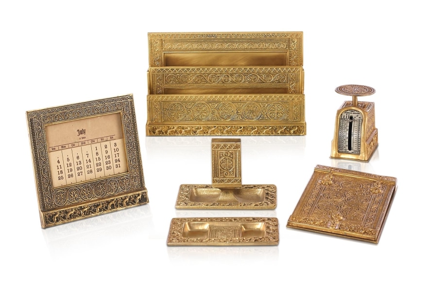 The Venetian pattern, with references to classical design, is of exceptional quality and detailing. Similar to the Abalone pattern, the Ventian pieces were only produced in a gilt bronze. The easily recognizable characteristic of this pattern is the edging band of ermines and verdue in deep relief. The flat surfaces are embellished with a design that resembles tooled leather and frequently has either polychromed or blackened recesses. Venetian was one of the largest of the desk sets, with at least thirty-eight objects. Only the Etched Metal and Glass and Zodiac patterns surpass this number of items.